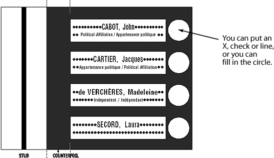 Бюлетината е малка, черен фон, имената на кандидатите в бяло. Полето за отбелязване е голямо бяло кръгче.